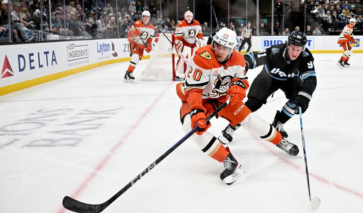 Anaheim Ducks right wing Brett Leason (20) reverses the puck with Utah Hockey Club right wing Josh Doan (91) defending him as they play at the Delta Center in Salt Lake City on Wednesday March 12, 2025. Utah won 3-2. | Scott G Winterton, Deseret News