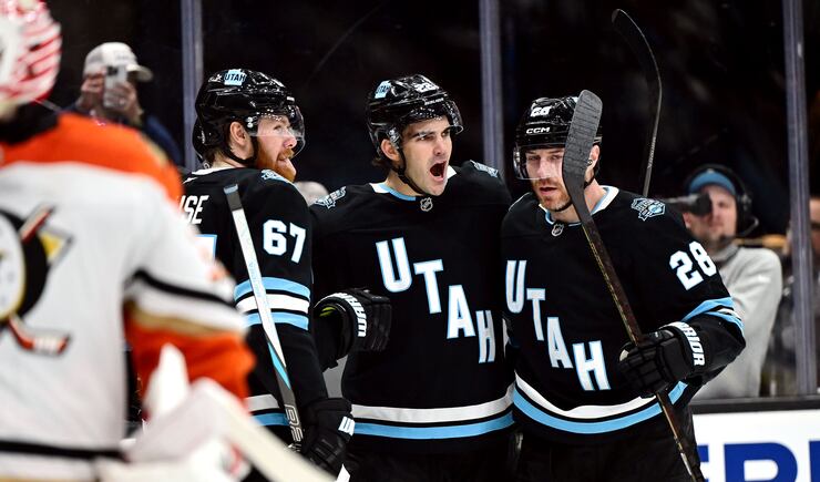 Utah Hockey Club celebrates a goal as they play at the Delta Center in Salt Lake City on Wednesday March 12, 2025. Utah won 3-2. | Scott G Winterton, Deseret News