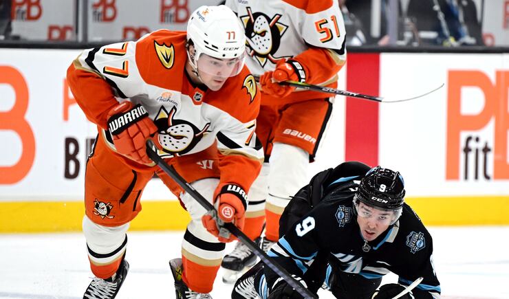 Anaheim Ducks right wing Frank Vatrano (77) takes the puck as Utah Hockey Club center Clayton Keller (9) falls to the ice as they play at the Delta Center in Salt Lake City on Wednesday March 12, 2025. | Scott G Winterton, Deseret News