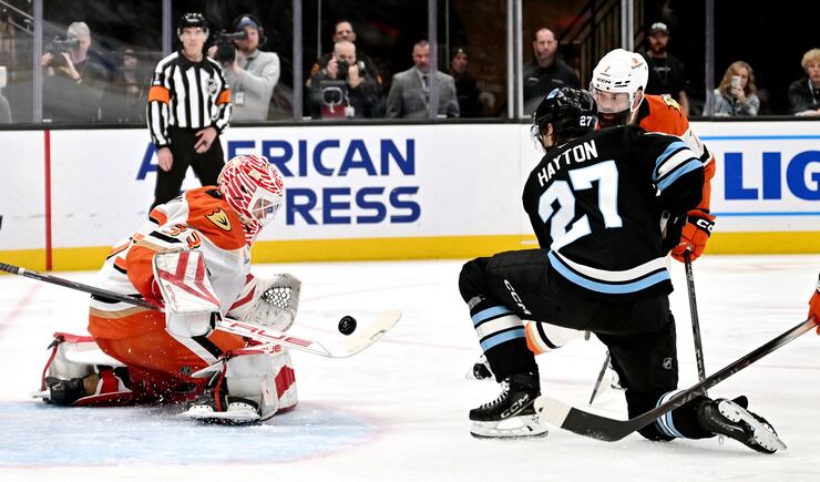Anaheim Ducks goaltender Ville Husso (33) stops a shot by Utah Hockey Club center Barrett Hayton (27) as they play at the Delta Center in Salt Lake City on Wednesday March 12, 2025. Utah won 3-2. | Scott G Winterton, Deseret News