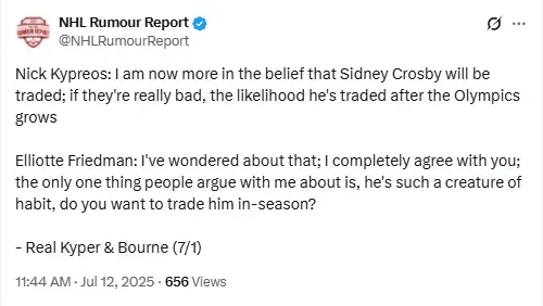 On the July 1 episode of the Real Kyper & Bourne podcast, analysts Nick Kypreos and Elliotte Friedman both highlighted the possibility of Crosby being moved, though they disagreed slightly on timing. Kypreos expressed strong confidence that a trade is coming if the team falters, while Friedman emphasized Crosby’s routine-oriented personality, suggesting any move would be carefully considered.