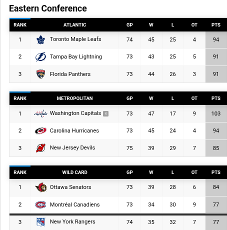 If Montreal ends up in the second wild card spot, they’ll cross over and play the Metropolitan Division winner, who is looking more and more like the Washington Capitals.