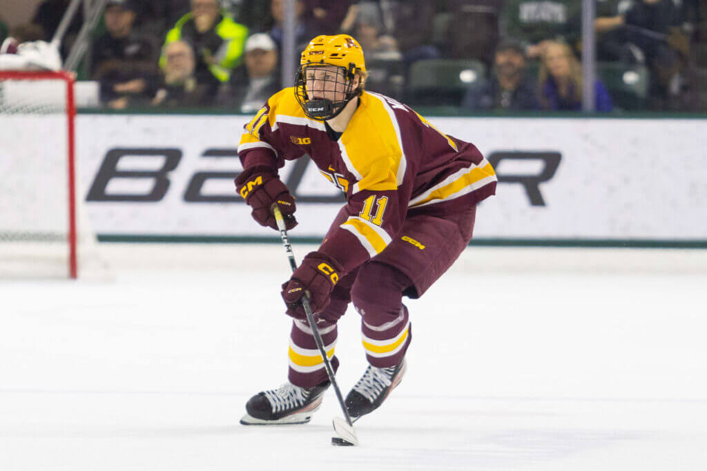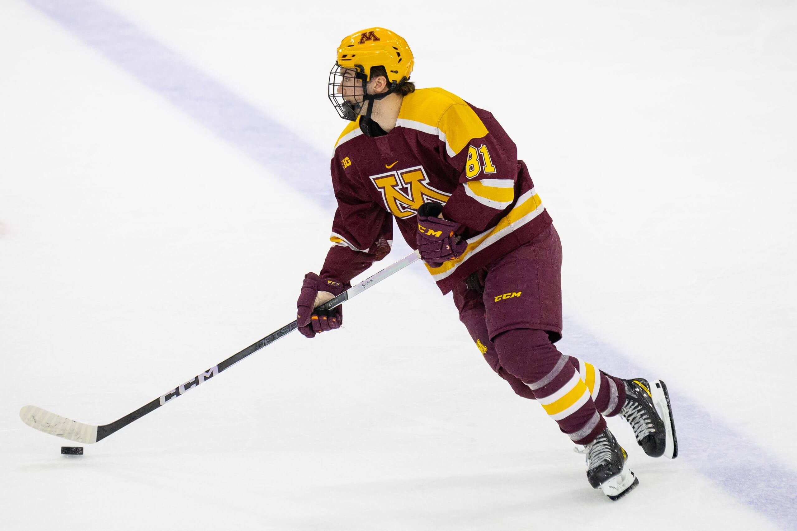 Wood was the youngest player in college hockey in his draft year (he was, for a moment, its only 17-year-old) and stepped right in to become an impactful offensive player and eventually the leading scorer on a good UConn team (albeit as a winger after playing mostly center at the Jr. A level, though he’s comfortable at all three forward positions). Two seasons ago, his counting stats as a sophomore took a bit of a hit, moving from 34 points in 35 games to 28 points in 35 games, but most of that was the byproduct of a much weaker UConn team (a team he still led in scoring by five goals and six points) — although it did highlight concerns some have about his ability to be a driver/his need to play with other good players who can get him pucks. Last season, after a transfer to Minnesota, he played to a point per game as the Golden Gophers’ second-leading scorer and was cut as a returnee to Team Canada ahead of the World Juniors before signing and registering one point in six NHL games.