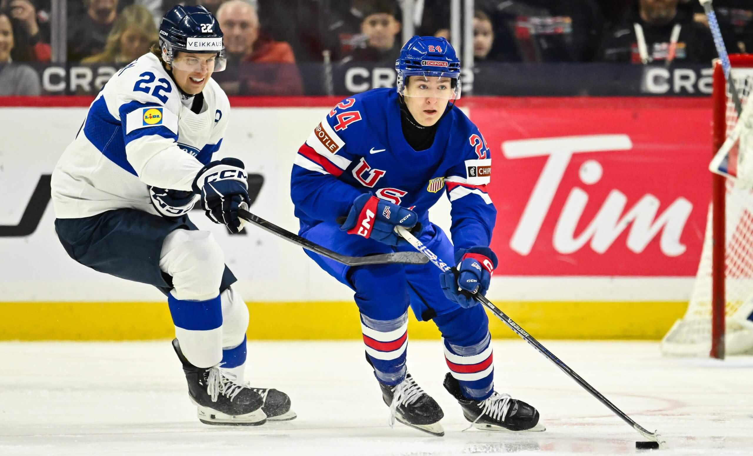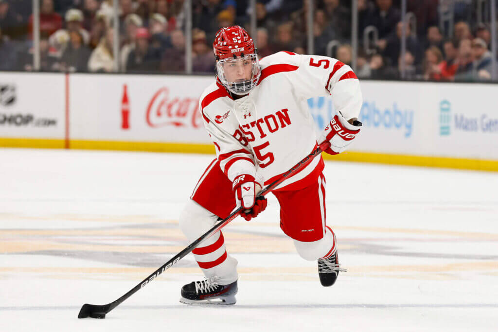He’s a plus-level skater and handler who plays an extremely involved game in all three zones, whether that’s activating into the rush or off the point, shaking pressure on exits or across/off the blue line (which he does extraordinarily well, making opposing players miss), working in and out of give-and-gos, or playing tight gaps against the rush. He’s a very busy player on both sides of the puck, and he gets in and out of his transitions and footwork so quickly that he can play that style. When he’s dialed in, applying pressure on and off the puck and using his feet and his skating to influence play, he can really impact a game in a lot of ways and take over play both offensively (with his activations and evasiveness in the offensive zone) and defensively (with his ability to swallow up top players). His shakes and deception have gone from a strength to a game-breaking quality. His head is always on a swivel. He opens up and walks the line to create lanes for his shot and pass so well, even working off his off-side. He side-steps past opposing players with ease. He has great hands (complemented by those inside edges and shoulder fakes). Some questioned his lack of physicality (with one scout even calling him soft) early on in his draft year but those questions have been emphatically answered in the last two years going to work on some of the more talented forwards in college hockey defensively in big moments — and top players at the World Juniors (I thought after a bit of an off start in this year’s tournament that he really elevated in the medal round and defended at a high level). He has learned that the faster he cuts off plays, the more he can play offense, and has really begun to take space more assertively defensively (on top of all of his stickwork and footwork). He’ll occasionally lose a battle in front or in the corner, but he defends at a high level in every other area, and his ability to shake and dance past and around coverage can really open up the offensive zone for his team when he’s out there.