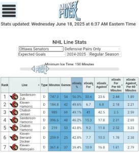 Another player to discuss is Travis Hamonic. He’s a player, that if his analytical statistics are studied, the Sens had success despite his time on ice. In 2024-25, Hamonic played with each of Sanderson, Chabot, and Kleven a fair bit. His best xGoals% was 49.6, perhaps surprisingly with Kleven. However, with both Sanderson and Chabot, Hamonic definitely brought their games down analytically. For instance, when Sanderson was with Artem Zub, they led the team at 56.3 xGoals%. Conversely, the Sanderson and Hamonic duo was 46.2%.