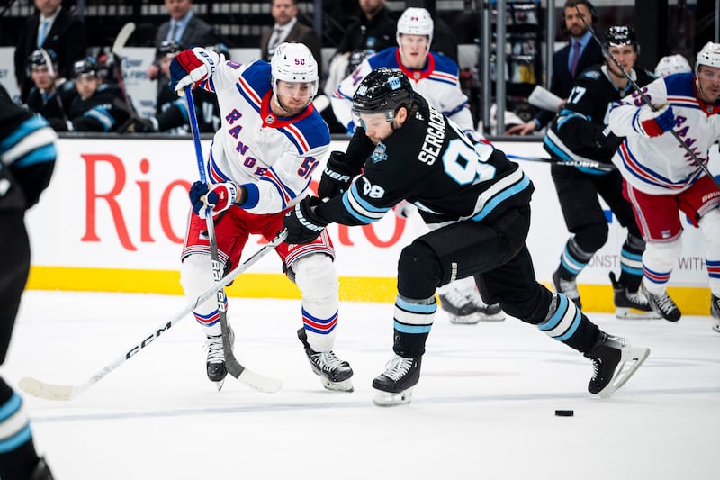 Utah Hockey Club defenseman Mikhail Sergachev (98) and New York Rangers left wing Will Cuylle (50) compete for possession of the puck during an NHL game held at the Delta Center in Salt Lake City on Thursday, Jan. 16, 2025. | Isaac Hale, Deseret News