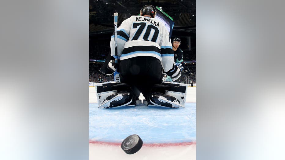 Yanni Gourde was perfectly in place to finish a rebound of a Ryker Evans shot into a mostly open net behind Vejmelka to tie the game at 1-1 with 1:54 left in the period. Less than a minute later, André Burakovsky redirected a lobbed shot from Schwartz through the legs of Vejmelka for another goal and a 2-1 Kraken lead.