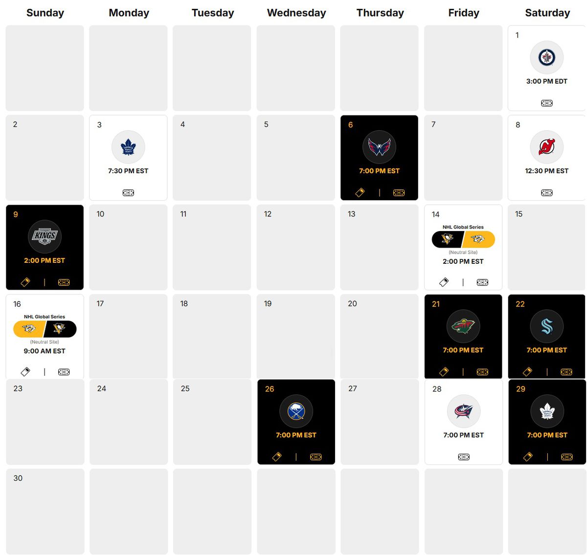 The big feature of the month of November is fit around the middle of the month. In between four days off on each side, the Pens go to Stockholm Sweden for two games against the Nashville Predators. (Sidenote: sort of a bummer to not have a Pens game in Nashville this season in one of the top road cities on most people’s lists.)