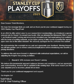 The ticket prices increase from round to round if the Golden Knights advance. For example, many tickets for lower bowl seats cost more than $500 each for Round 2. VGK owner Bill Foley shares the postseason ticket revenues with the National Hockey League. The Knights contacted season ticket holders to clarify its postseason ticket price policy.