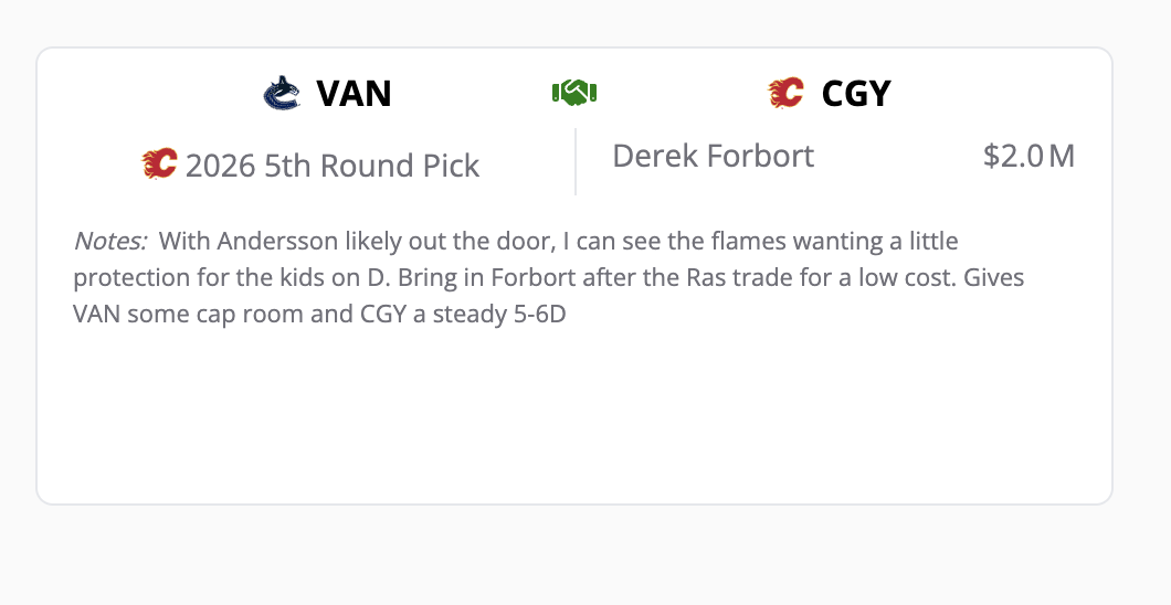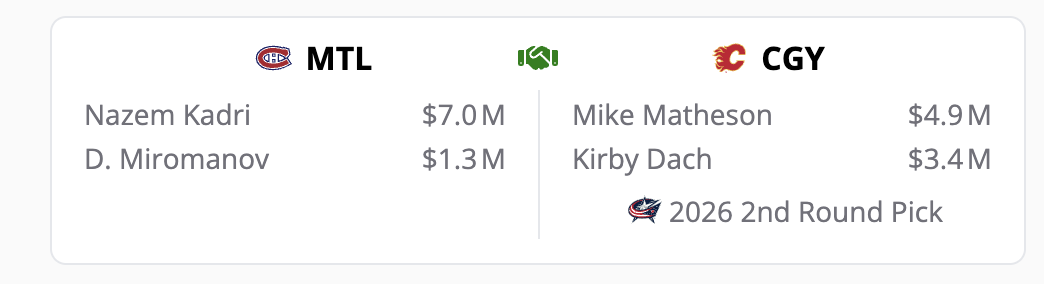 Any trade involving Daniil Miromanov immediately catches my attention. The defenceman acquired in the Noah Hanifin trade has not had much luck in Calgary and has been a regular scratch. They were looking to ship him off at the last trade deadline, but it never came to fruition. It comes back to clearing more space for younger and more talented players who have earned a shot at the NHL.