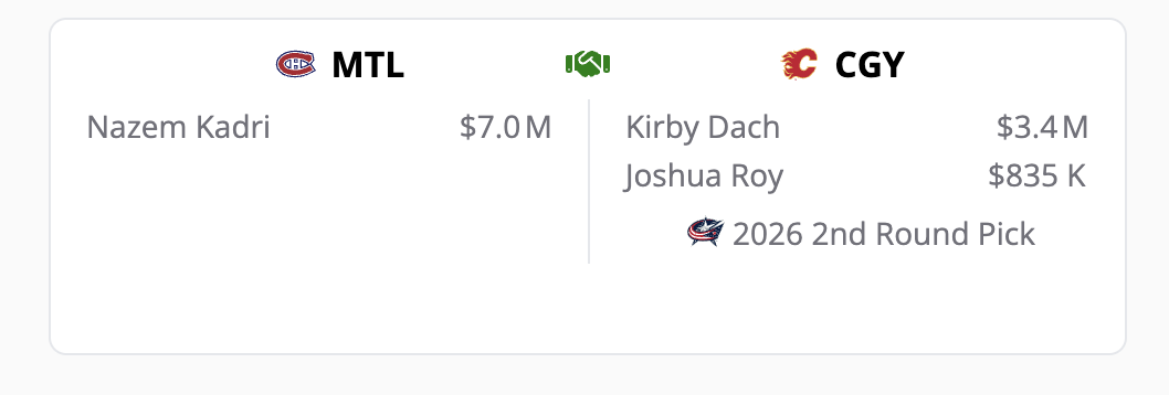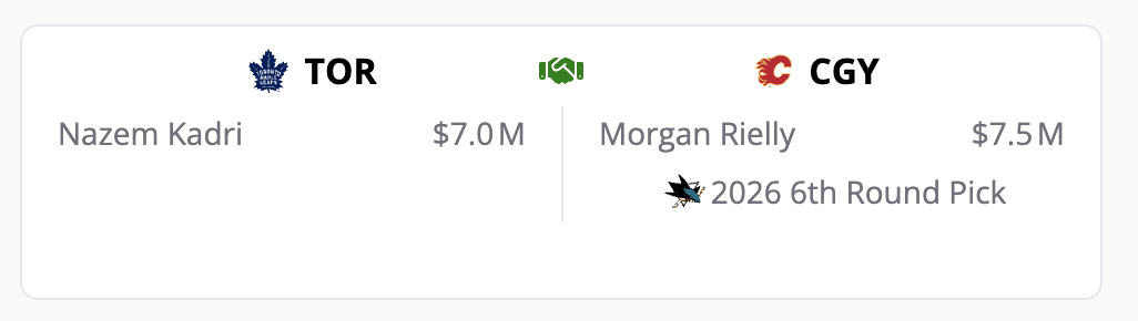 There is simply no way this ever happens. I’ve written about the Flames taking on cap dumps, but I don’t see it happening in exchange for Nazem Kadri. Morgan Rielly and the San Jose Sharks’ sixth-round pick. Really? Craig Conroy would probably block Brad Treliving’s email and phone number. Who can blame him?