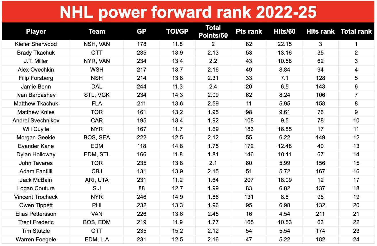 5. Over the last three regular season, if we rank forwards on hits and points per 60 minutes of even strength play, Frederic ranks 22nd overall. McBain ranks 17th, Jeannot 154th and Brown 425th.