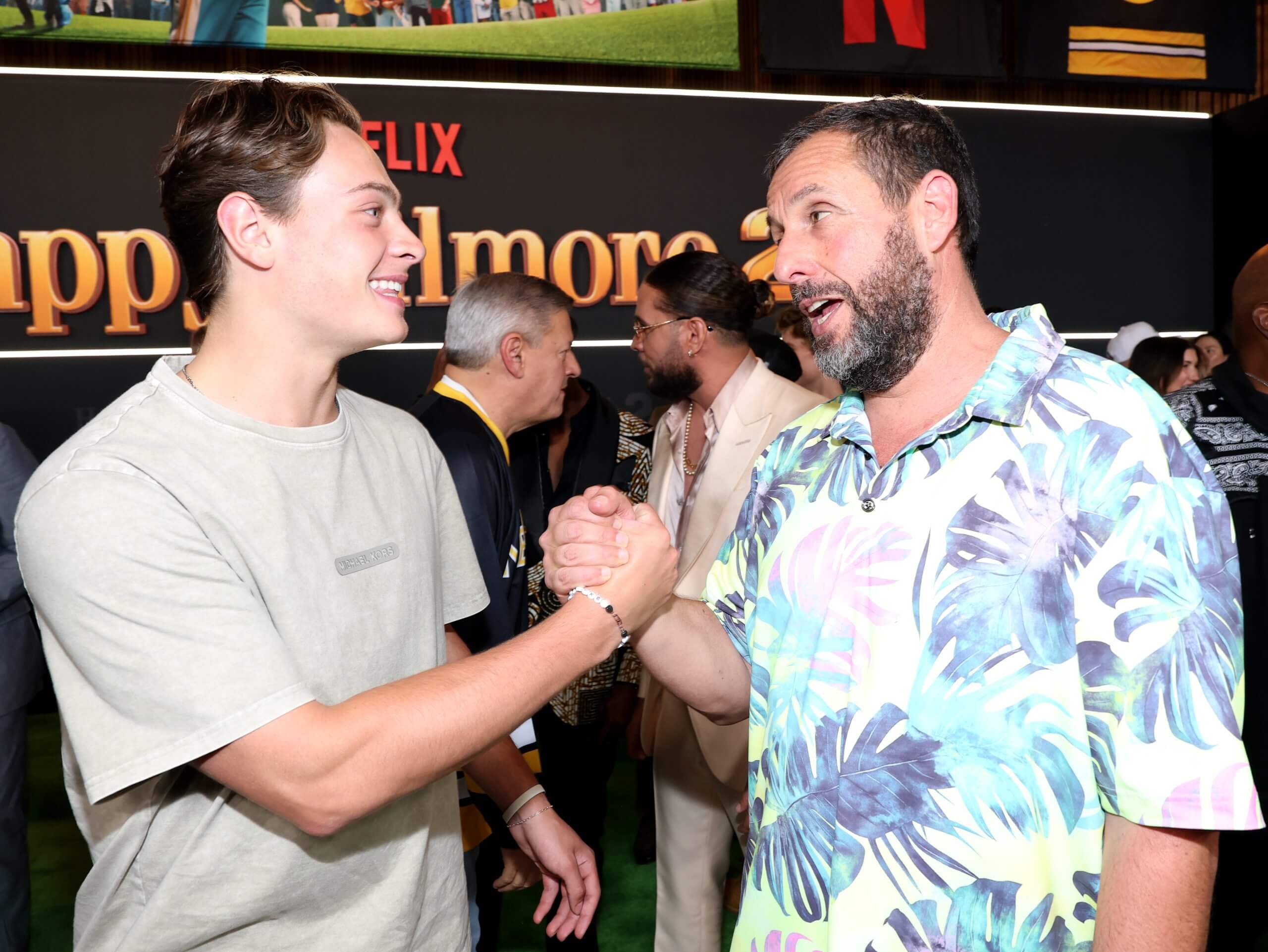 Adam Sandler meets Bruins draft pick James Hagens at the “Happy Gilmore 2” premiere. (Kevin Mazur / Getty Images for Netflix)