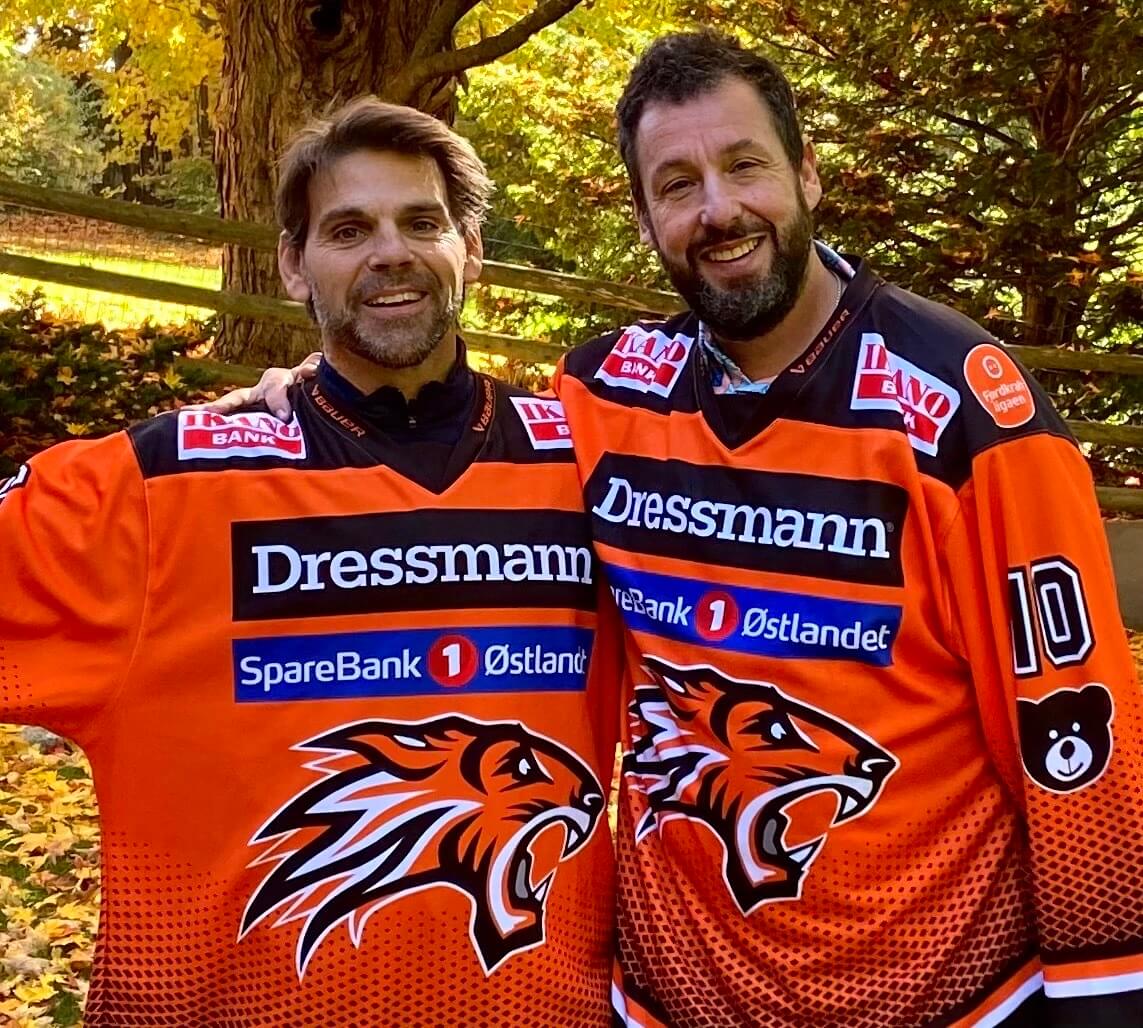 Adam Sandler and Kyle McDonough pose recently in jerseys from Frisk Asker, one of McDonough’s overseas hockey teams. (Courtesy Kyle McDonough)