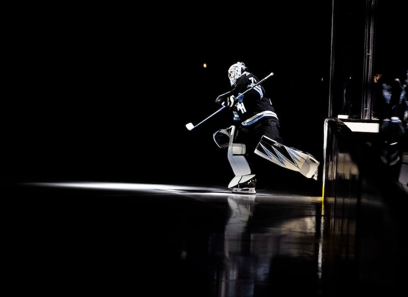 Utah Hockey Club goaltender Karel Vejmelka (70) comes onto the ice before an NHL game between the Utah Hockey Club and the Los Angeles Kings at the Delta Center in Salt Lake City on Thursday, April 3, 2025. | Brice Tucker, Deseret News
