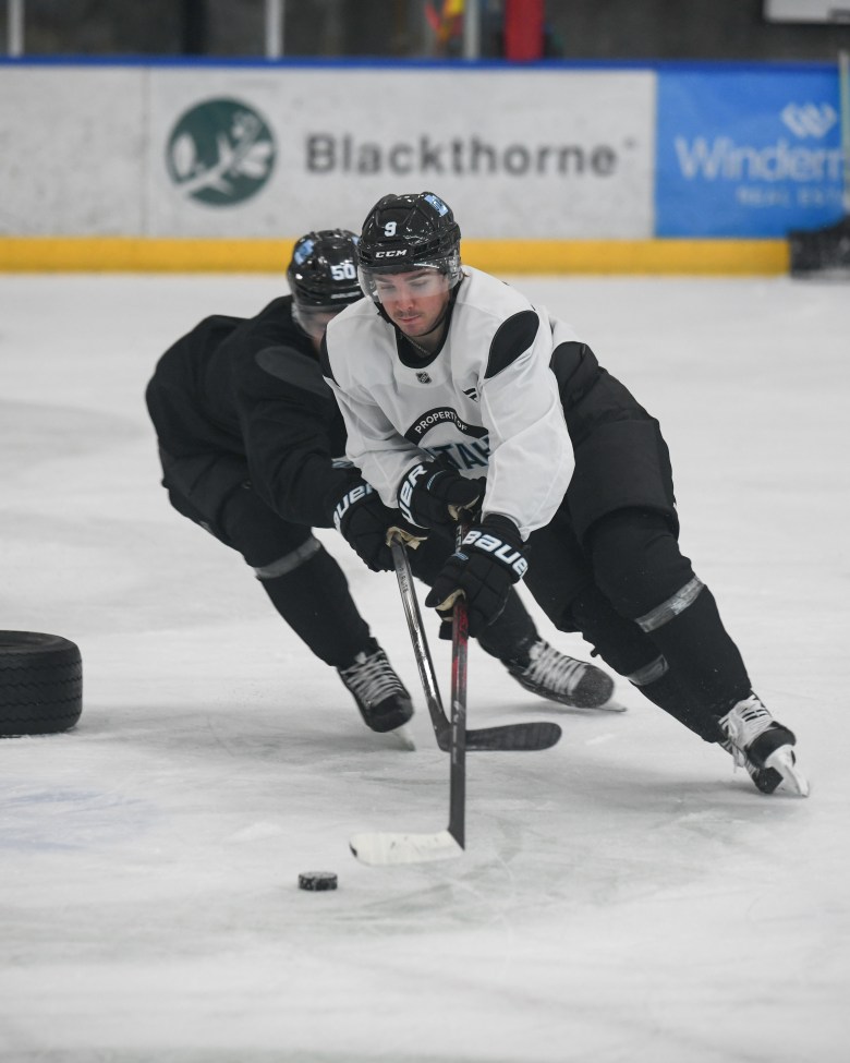 Clayton Keller works the puck past a defender during a drill on Friday. Keller was named the first captain in franchise history earlier in the day. Credit: Clayton Steward/Park Record