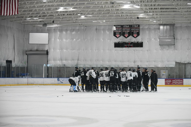 The Utah Hockey Team huddles during practice on Friday in Park City. Credit: Clayton Steward/Park Record