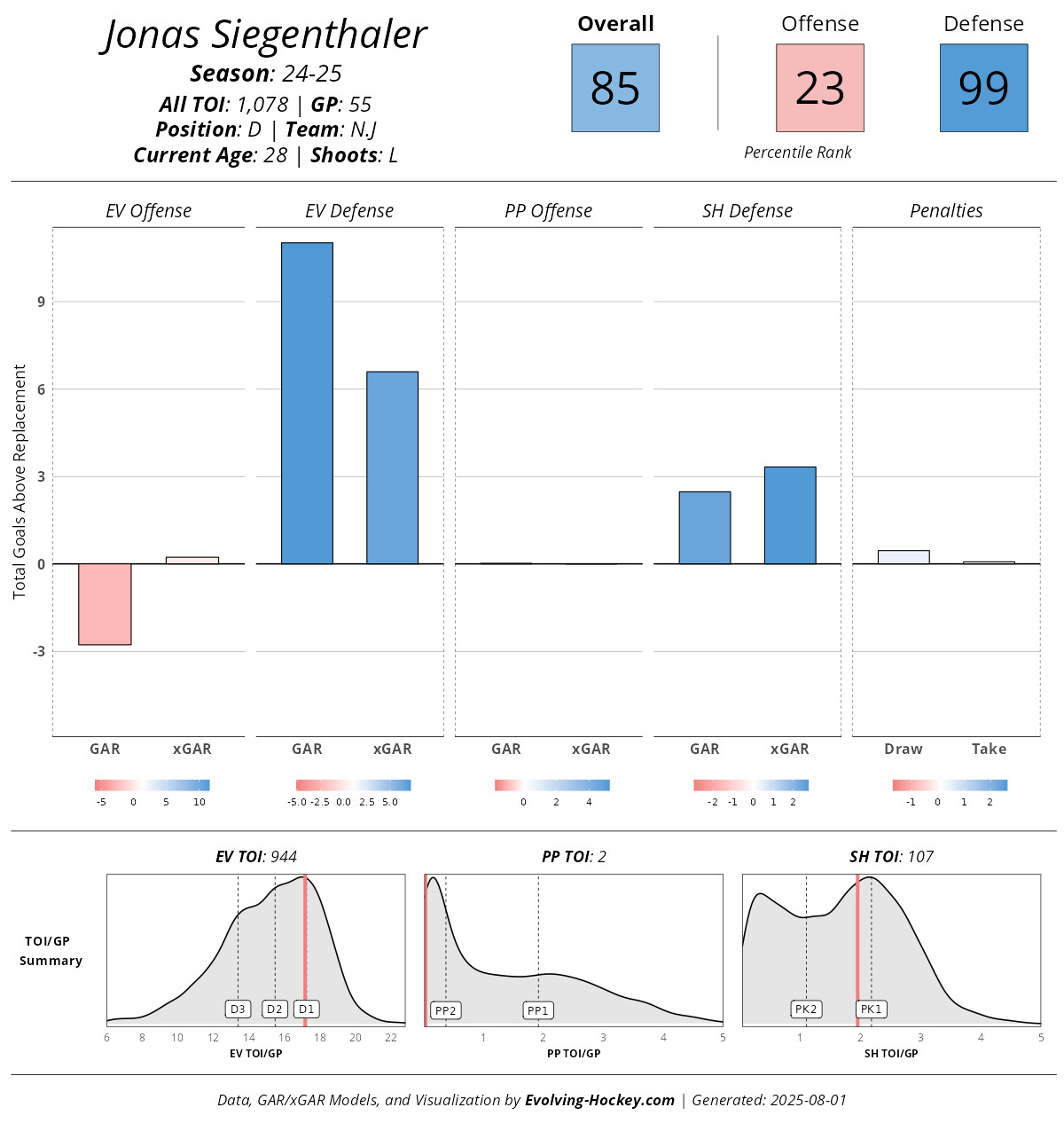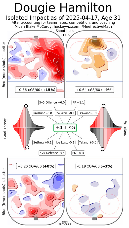 Some might want his contract to read $8 million instead of $9 million, but it’s too marginal a difference to make a fuss over when Hamilton is still capable of putting up 60 or so points in a full season. He is effective in all situations — even on the penalty kill (where he will likely have to play again in Kovacevic’s absence) — and the Devils regularly win his matchups when he plays with top six lines. Paired primarily with Brenden Dillon in 2024-25, that duo ranked 18th out of the 62 pairings with 500 minutes together with a 56.58 goals for percentage and 20th in expected goals percentage at 53.53%. The Devils play very high-event hockey with those two on the ice, with that pairing ranking third in on-ice shots for per 60 minutes (32.59) and second in goals for per 60 (3.57, just behind the Vince Dunn — Adam Larsson pairing in Seattle). Their 3.15 expected goals per 60 also ranked fourth among the 62-most played pairings in the league. This offense far outweighs the defensive downside. HockeyViz estimates Hamilton’s total offensive impact to be over twice as beneficial (+6.0 5v5 offense sG + 1.1 PP offense sG) as his total defensive impact is detrimental (-3.3 5v5 defense sG + 0.3 PK defense sG). He’ll get back to scale-breaking status if he starts scoring more goals again.