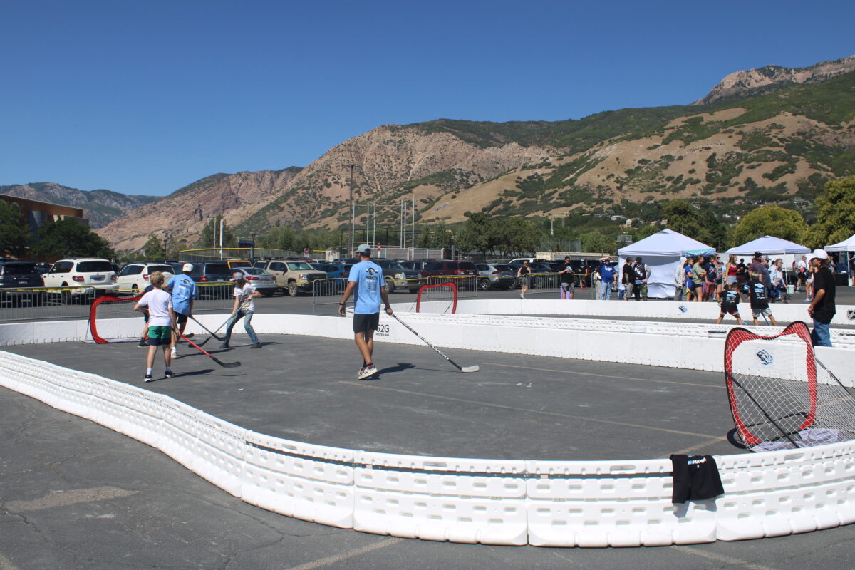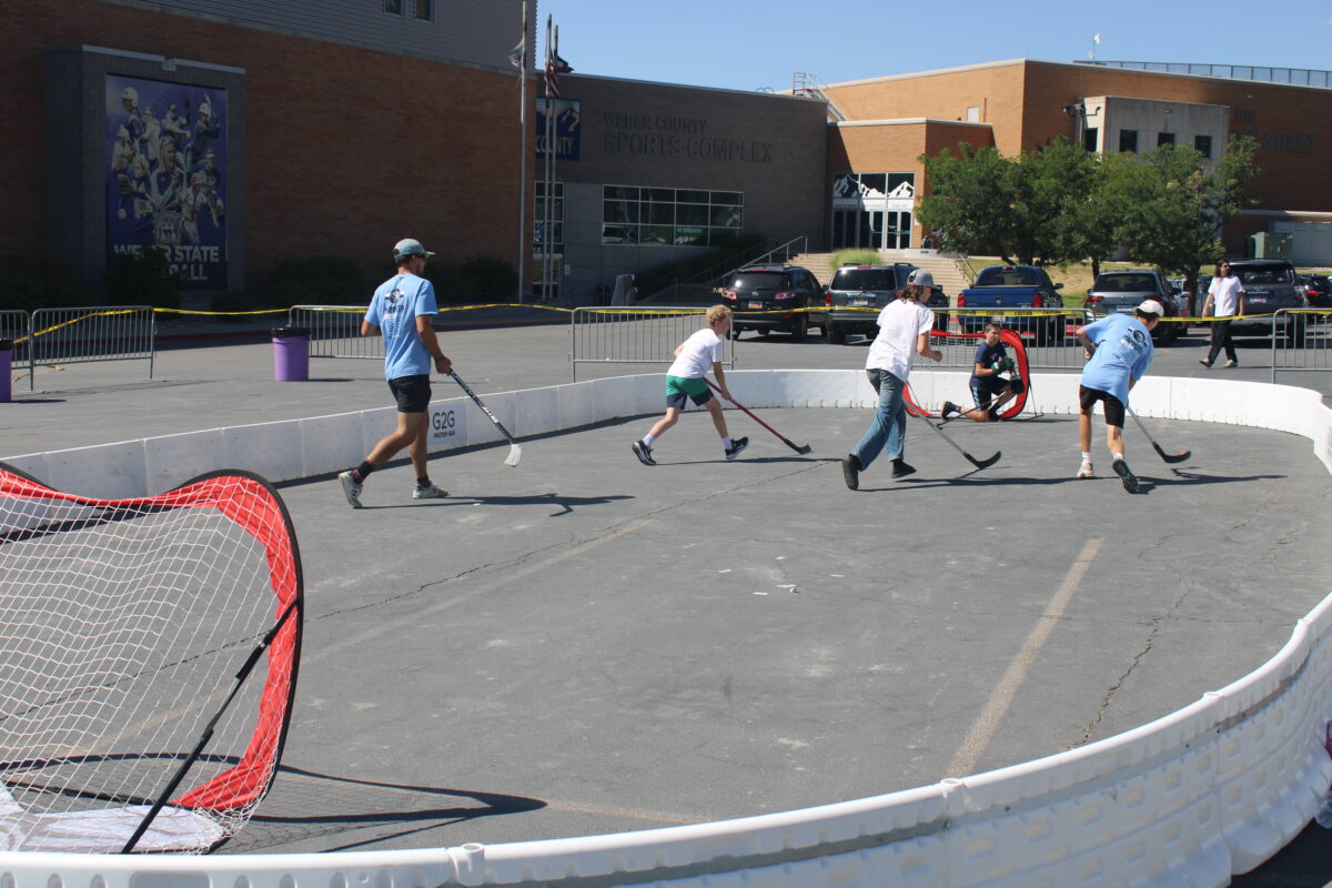 Locals compete in a street hockey game at the Utah Mammoth Week fan fest on Thursday, July 31, 2025, at the Weber County Sports Complex in Ogden.