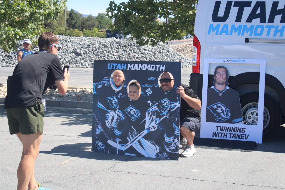 From left, Sarah Williams, Dallas Child and Mike Child of North Ogden pose with a photo board at the Utah Mammoth Week fan fest on Thursday, July 31, 2025, at the Weber County Sports Complex in Ogden.