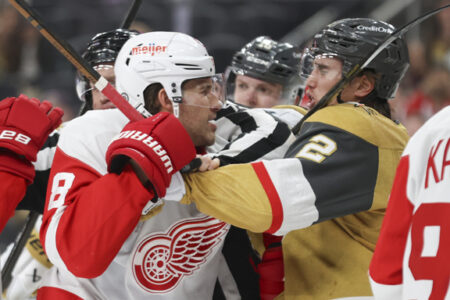 Detroit Red Wings defenseman Ben Chiarot, left, and Vegas Golden Knights defenseman Zach Whitecloud fight during the third period Saturday in Las Vegas. (AP photo)