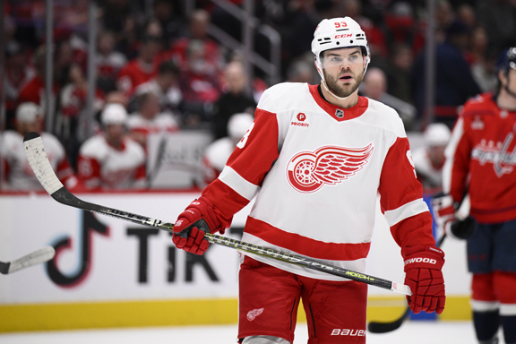 Detroit Red Wings right wing Alex DeBrincat waits for action to restart during the second period against the Capitals on March 18 in Washington. (AP file photo)
