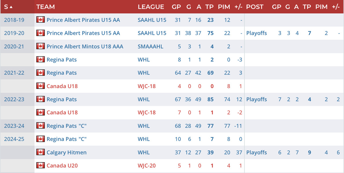 The former teammate of Connor Bedard and captain of the Regina Pats adjusted from a midseason trade to score 39 points (12 goals, 27 assists) in 37 games with the Calgary Hitmen.