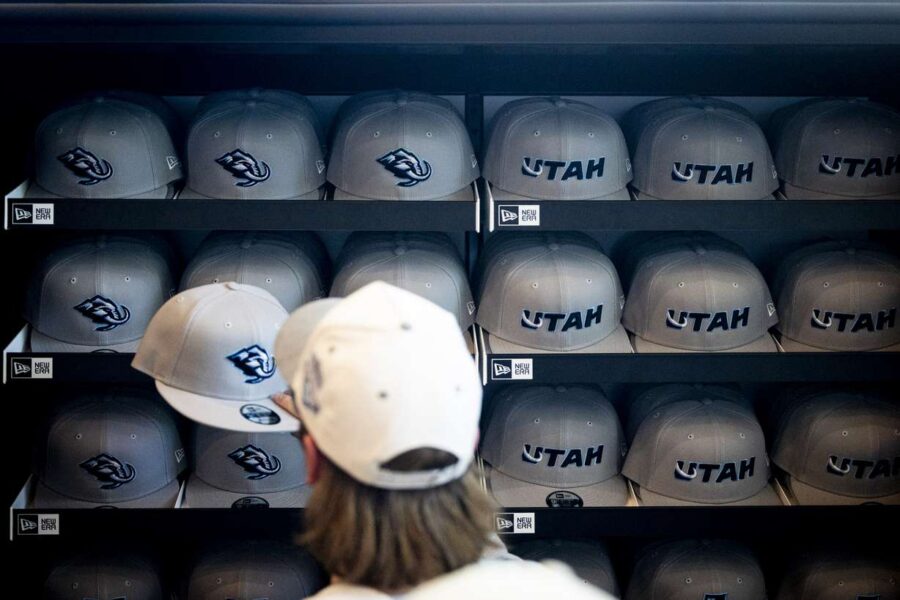 A person shops Utah Mammoth hats in the team store after a press conference announcing the Utah Hockey Club was changing its name to Utah Mammoth, at the Delta Center in Salt Lake City on May 7. (Photo: Isaac Hale, Deseret News)
