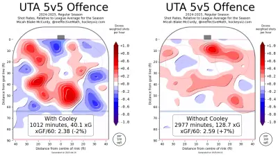 Utah’s offense couldn’t convert goals in the slot. They ranked third overall in high danger Corsi (54%) but 15th in high danger goal share (51%). A factor in this is Cooley’s tendency to pass in the slot rather than shoot.