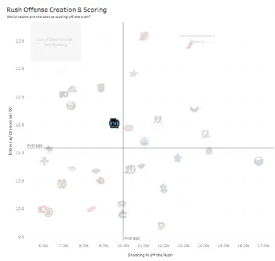 Utah led the league in rush offense/60 (15.03) according to All Three Zones. But they had poor shooting off the rush with a 9.6 SH%. League average was 10%. They were also above average in rush entries with chances/60 with 11.53.