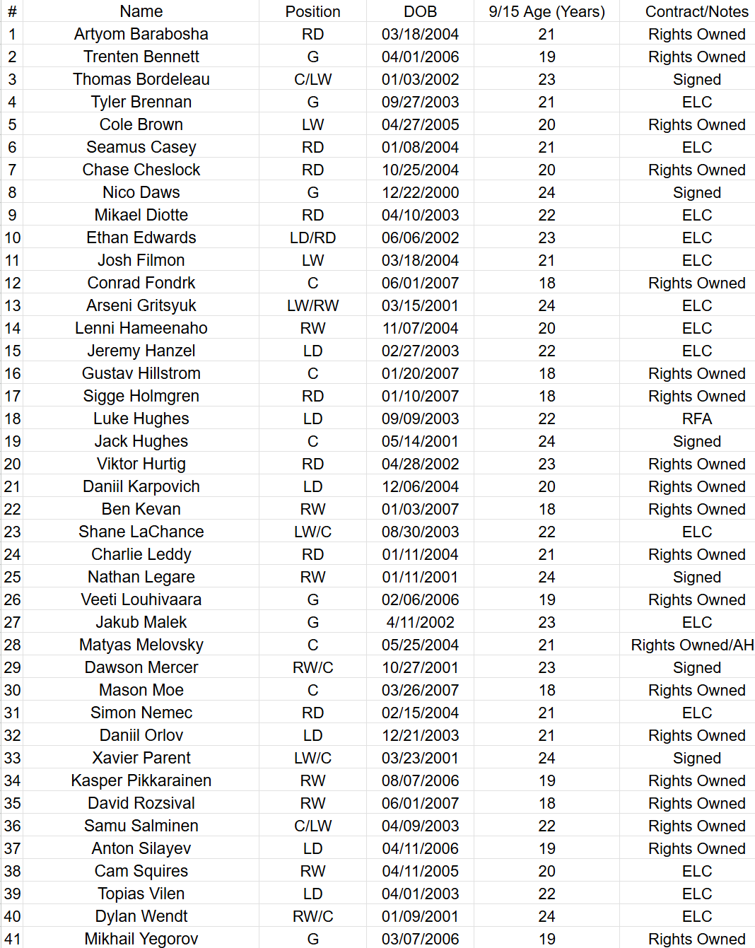 As always, eligibility for the AATJ Top 25 Under 25 is rather simple: if the player is a member of the New Jersey Devils organization, whether signed to a contract or on their reserve list, they can be ranked as long as their birthdate is after September 15, 2000. If someone turns 25 on September 16, 2025, they would still be eligible for the list. In total, the New Jersey Devils have 41 players in the NHL organization under the age of 25.