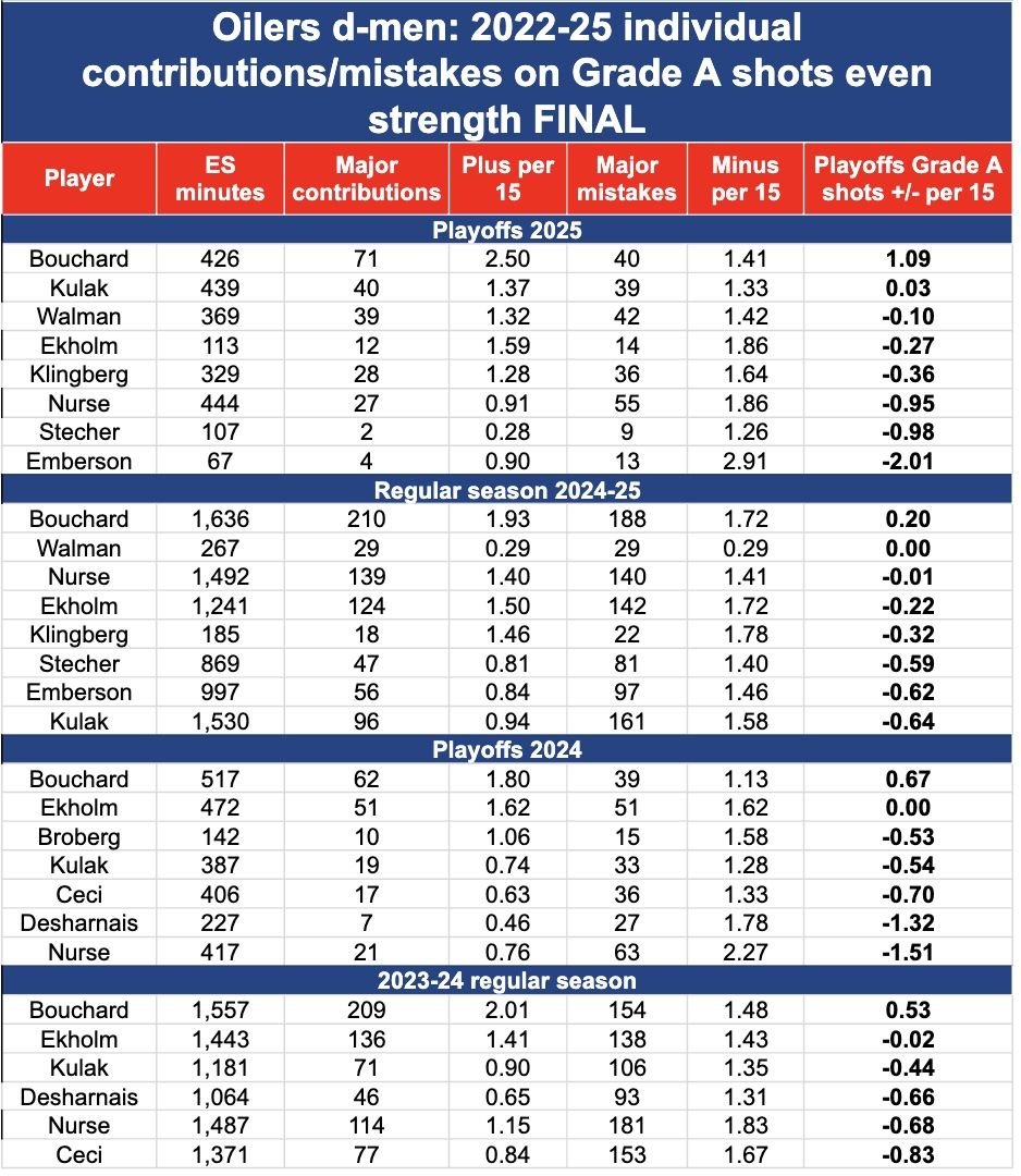 3. If you rate Edmonton’s d-men by how many even strength Grade A shots they help create compared to how many mistakes they make on Grade A shots against, Bouchard has been Edmonton top d-man for the past two regular and playoff seasons — and it’s not close.