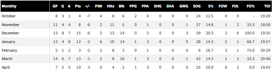 We already discussed how Rust’s top end speed has declined as he has aged, but the scoring has shown no signs of slowing down. He’s made the high danger area his home and has found great success both scoring and assisting from that area. With a slew of young prospects set to make the leap next season, it will be interesting to see where Rust slots in come October. If he’s still skating with 87 and 67 then you should be able to sharpie in another stellar season from Rust.