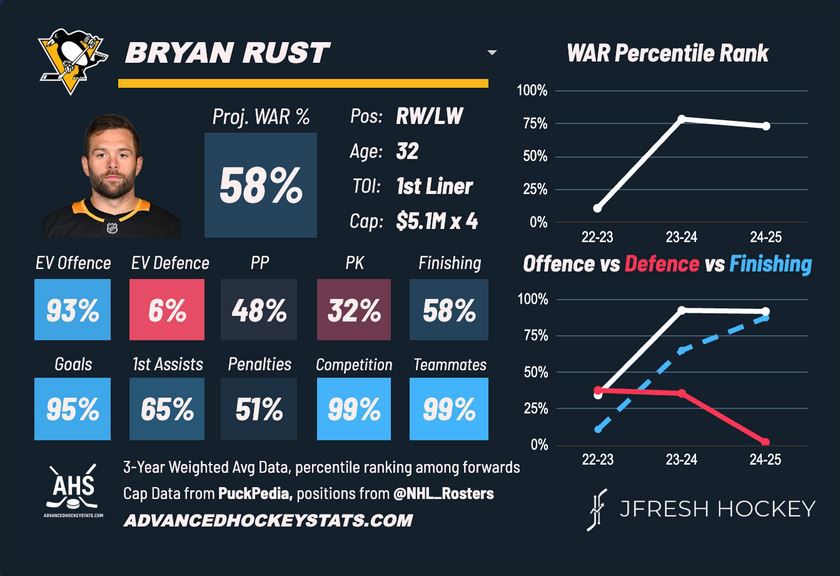 Injuries (and COVID) were one issue that always seemed to hold Rust back from hitting higher career marks, but even with missing 11 games in 2024-25, he reached new highs across the board. He was drafted as a third round lottery ticket 15 years ago and developed into one of the most important Penguins of the Crosby/Malkin generation of Penguins hockey.