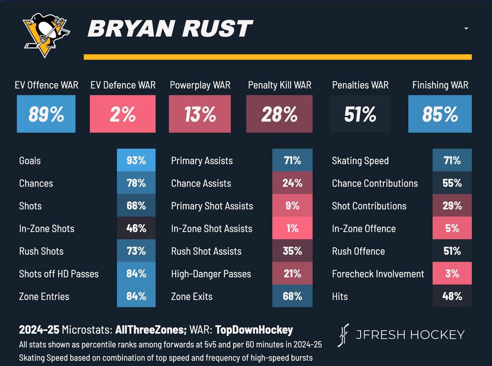 Rust scores, he creates chances, he’s good on the rush and gets the puck into the zone successfully much more often than not. He has developed a reputation as a penalty killer but the underlying numbers don’t lend a ton of support to that reputation. In fact, he’s not much of a special teams ace in any scenario. Five-on-five hockey is where he thrives.
