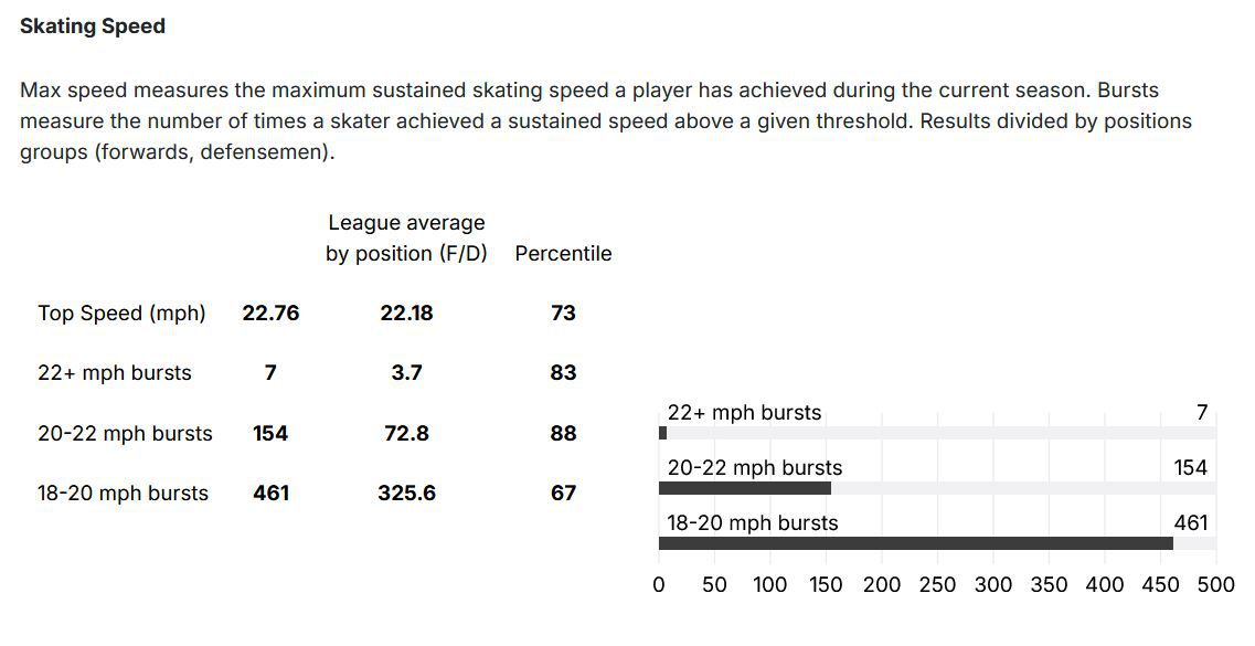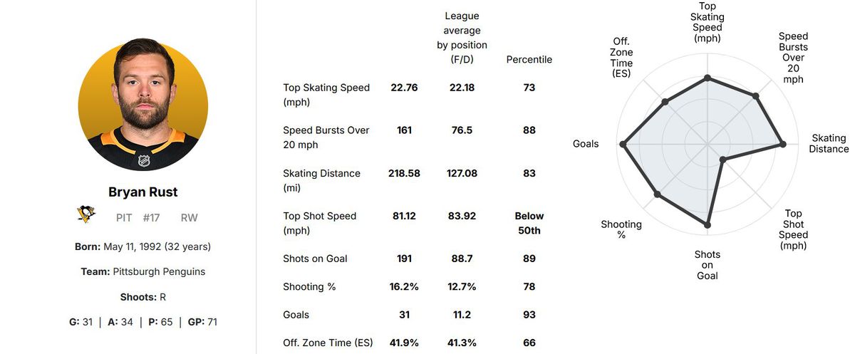 Despite being 32 years old, Rust can still scoot on the ice, even if his top end speed has dropped off compared to his younger seasons. He still produces fast bursts just not quite as fast. Playing on a top line with Crosby and Rakell makes his skating ability a huge plus and leads to higher production. He’s never had the most dangerous shot in terms of speed and power, but he’s deadly accurate and gets to pucks in the dirty areas.