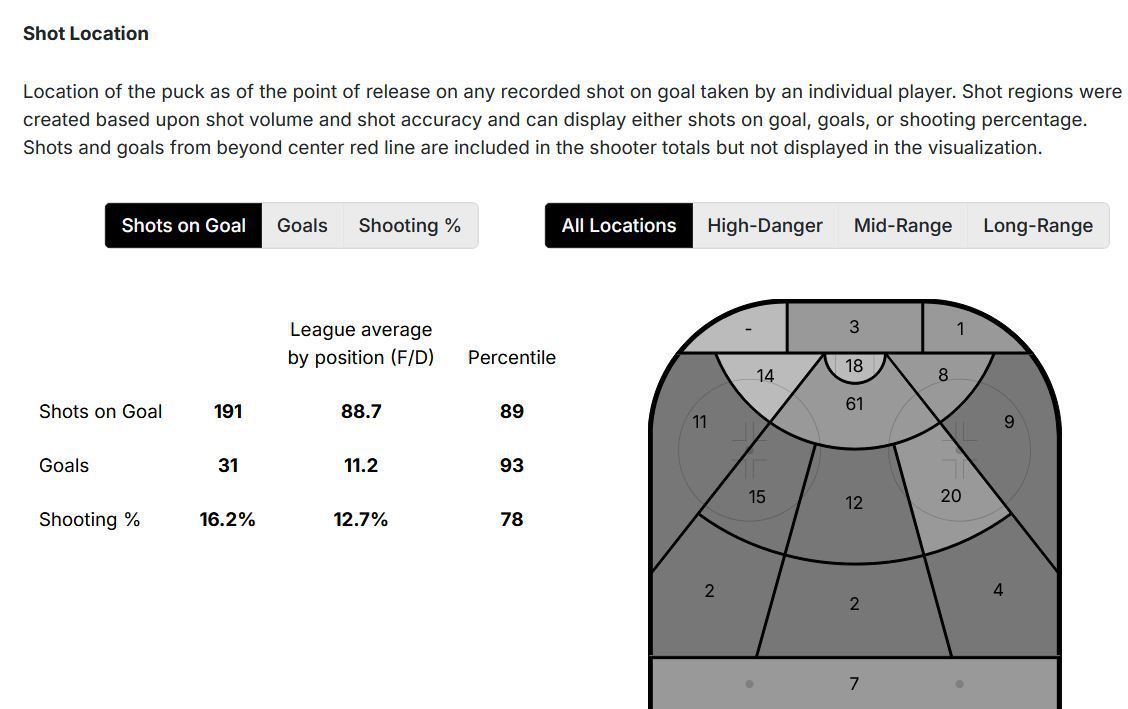Rust has developed into a wizard around the goal, a potential side effect of playing with Sidney Crosby all these years. Of this 31 goals this season, 13 came from from the high danger area in the offensive zone, where he generated a whopping 79 shots on goal.
