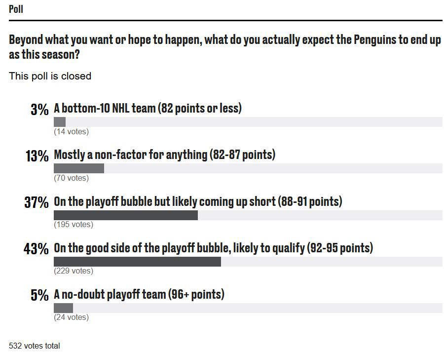 Looking back, it’s a bit wild over 60% of folks here thought or at least voted with their hearts to expect the playoffs. Pittsburgh didn’t upgrade at all over the off-season, using most of their cap space to take on unwanted players like Kevin Hayes and Cody Glass and/or make short-term bets on players like Anthony Beauvillier and Matt Grzelcyk. Some of those guys play well and were traded for a second or third round picks, some of them, well not so much.