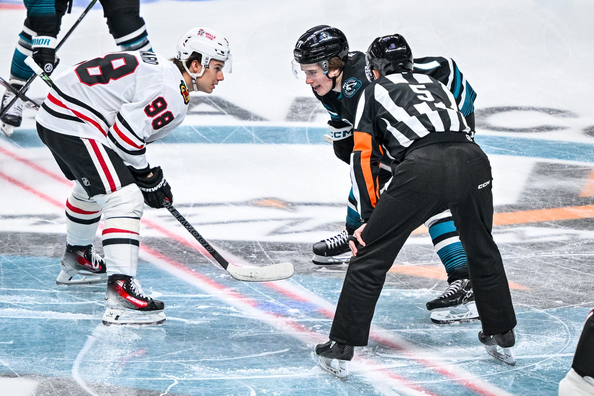 Tait: “Mano-a-mano. The two No. 1 picks from the last two drafts, Connor Bedard and Celebrini played together growing up in North Vancouver. Both have the weight of their respective franchises on their shoulders. I was looking to see how they would greet each other at center ice, Bedard smiled and said hi first. In this image Celebrini is talking to Bedard with veteran referee Chris Rooney also joining in the conversation.”