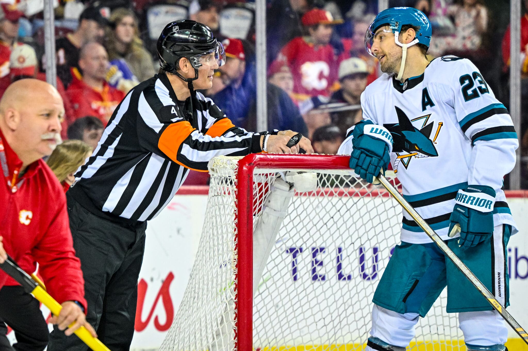 Apr 13, 2025; Calgary, AB, Canada; during San Jose Sharks at Calgary Flames at SaddleDome. Photo: Sport Shots/Dean Tait