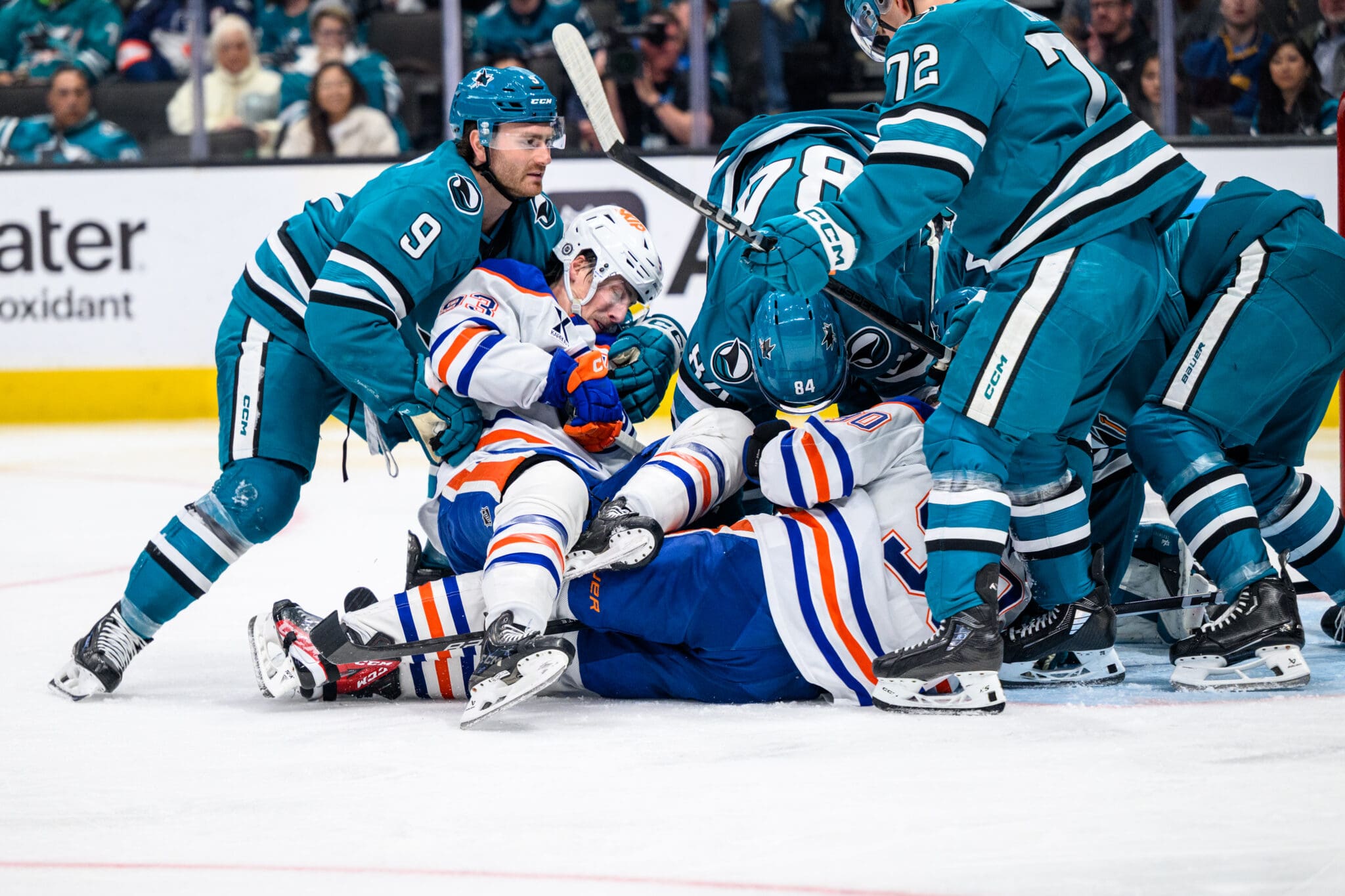 Apr 16, 2025; San Jose, CA, USA; Edmonton Oilers vs San Jose Sharks at SAP Center. Photo: Sport Shots/Dean Tait