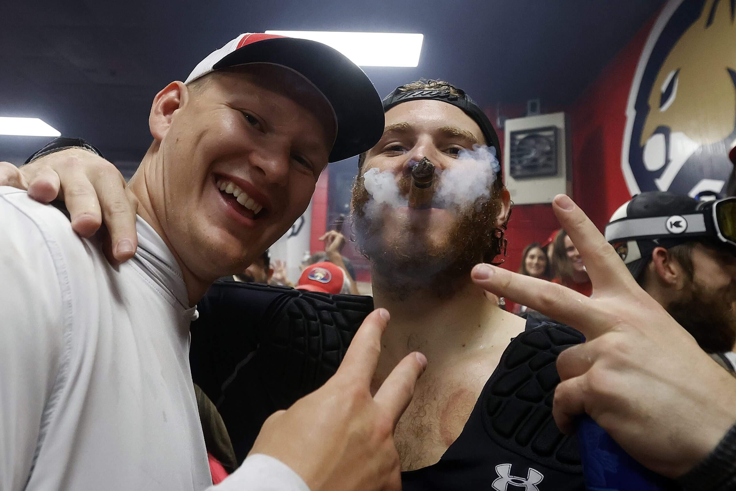 Brady Tkachuk, left, celebrates with Matthew Tkachuk after the Panthers clinched the Cup in June against Edmonton. (Eliot J. Schechter/NHLI via Getty Images)