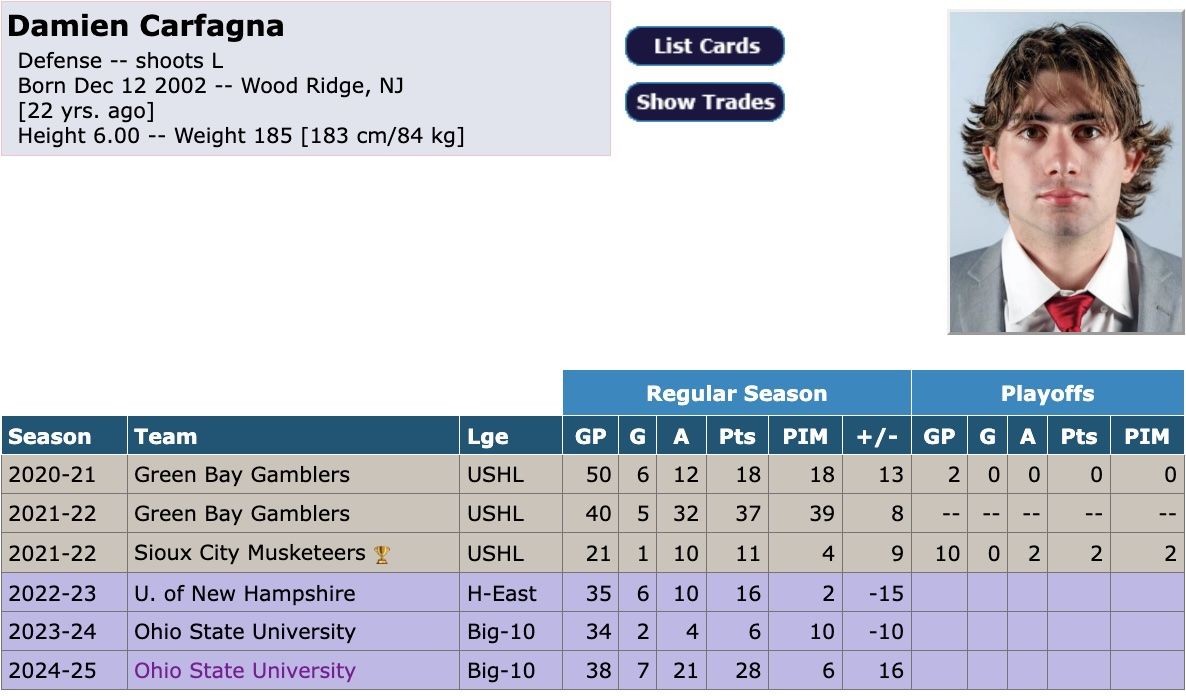 GM Stan Bowman signed Carfagna as a college free agent this spring, the player having completed three years of college play, scoring 28 points in 38 games for Ohio State.