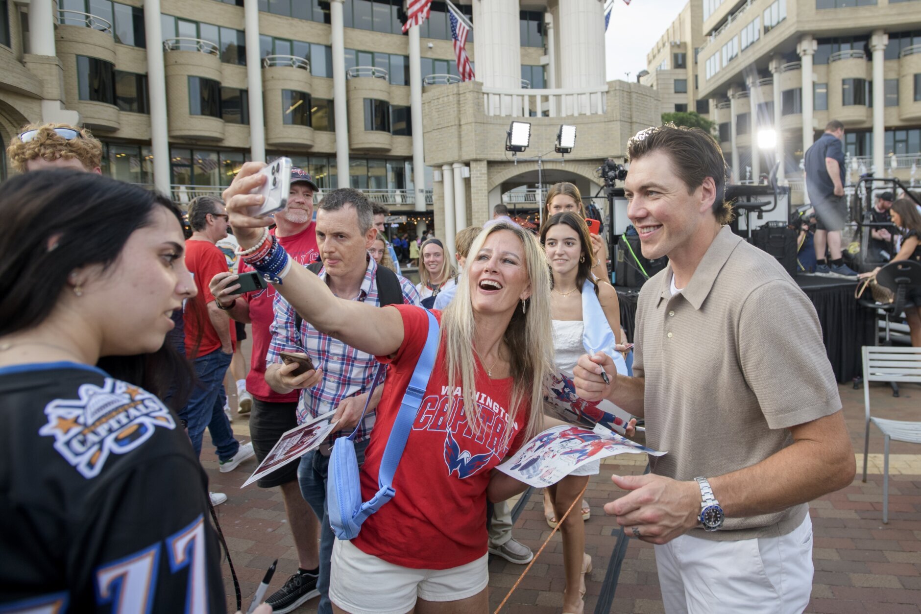 Capitals Hockey Washington Capitals forward T.J. Oshie, right, poses for a selfie with a fan after announcing his retirement from the NHL at Washington Harbour, Monday, June 9, 2025, in Washington. (AP Photo/Rod Lamkey, Jr.)