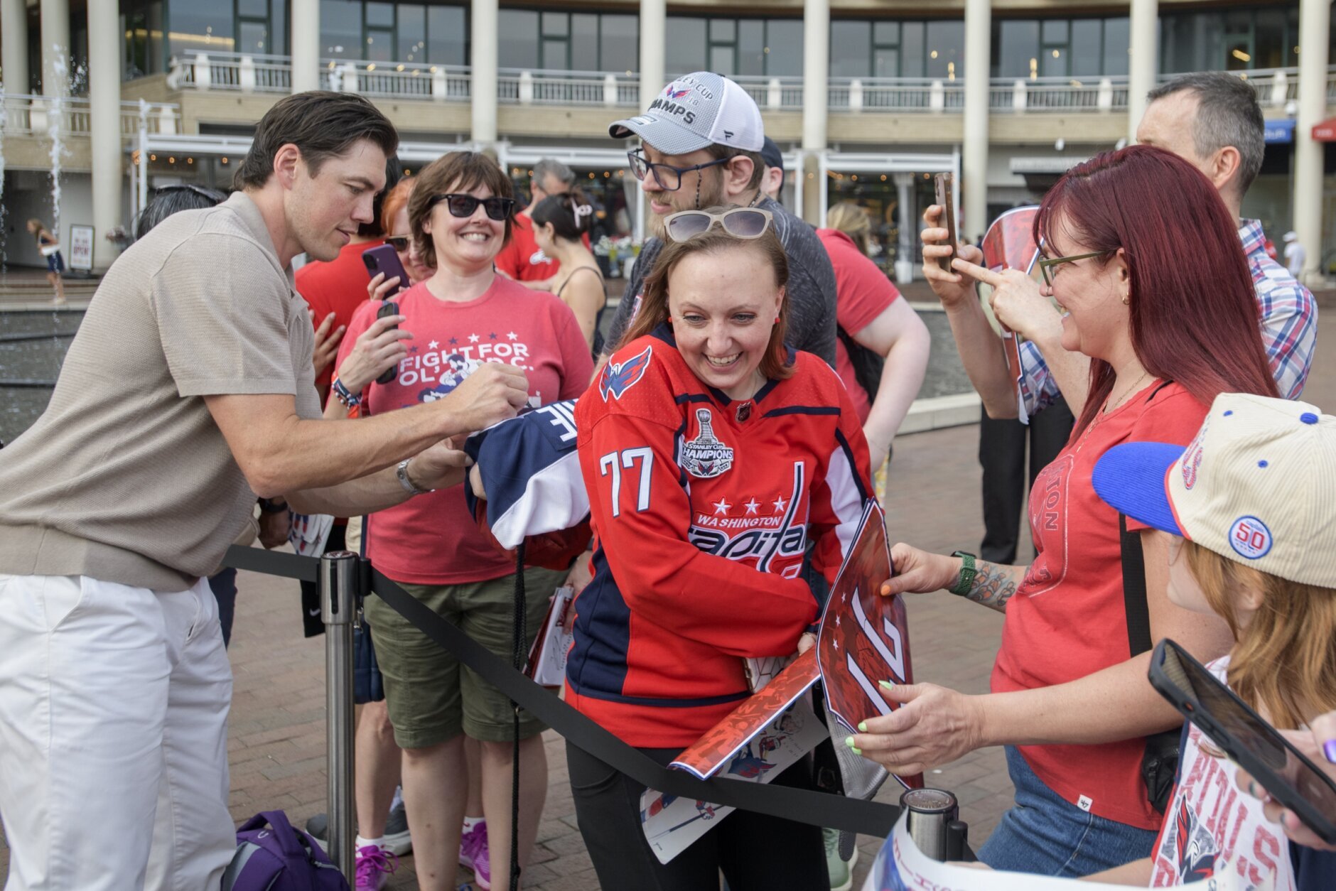 Capitals Hockey Washington Capitals forward T.J. Oshie, left, signs autographs for fans after announcing his retirement from the NHL at Washington Harbour, Monday, June 9, 2025, in Washington. (AP Photo/Rod Lamkey, Jr.)
