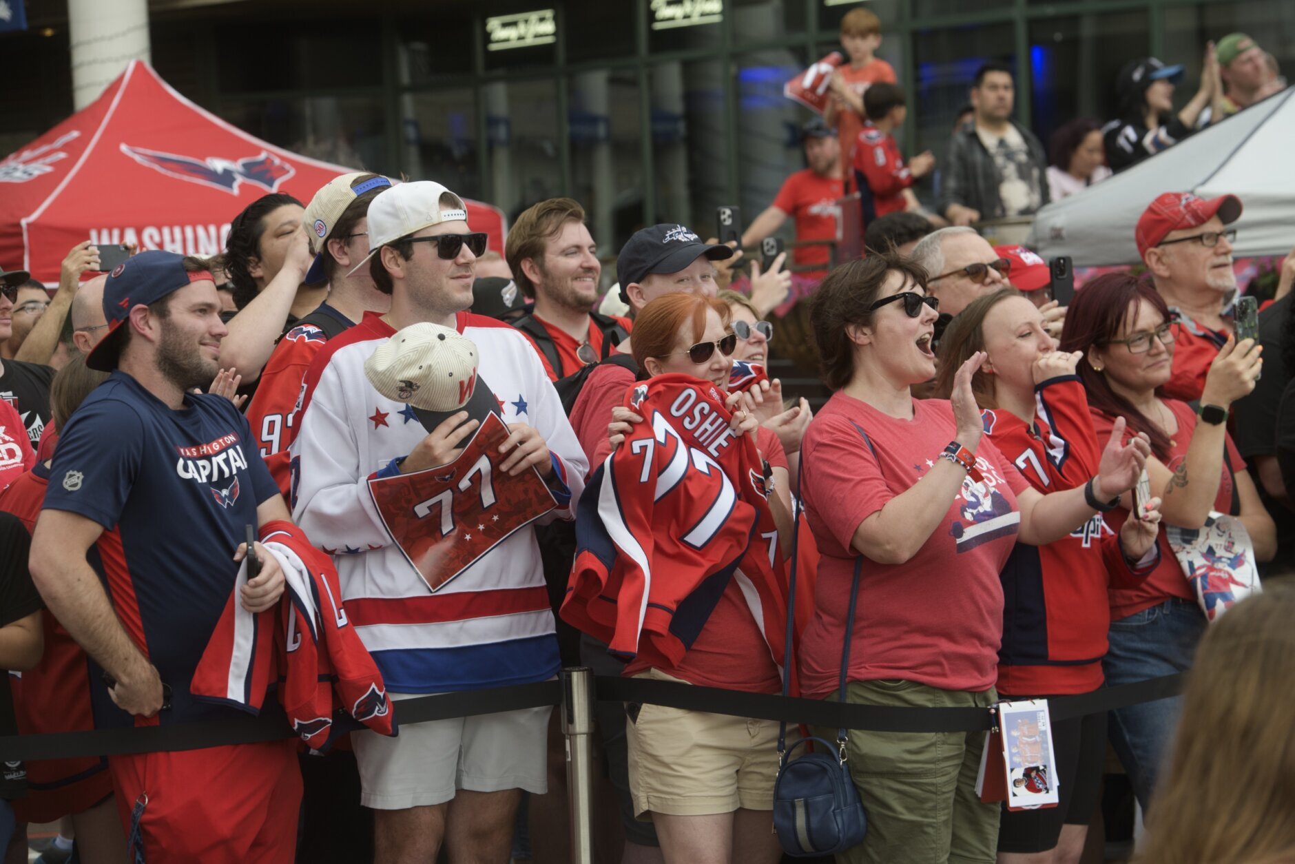 Capitals Hockey Washington Capitals fans cheer as they await for the arrival of Washington Capitals forward T.J. Oshie, prior to his announcement of his retirement from the NHL, at Washington Harbour, Monday, June 9, 2025, in Washington. (AP Photo/Rod Lamkey, Jr.)