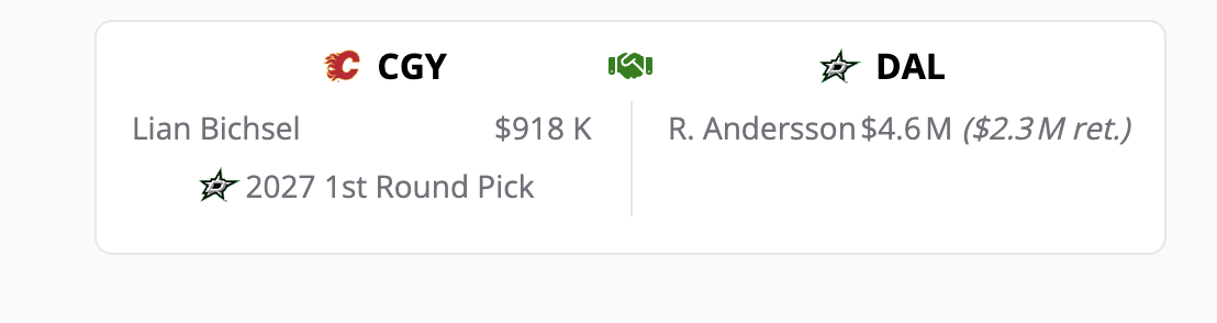 Oh, look! It’s a Rasmus Andersson trade. This is a trade that’s been explored before. Adding another 2027 first-round pick immediately piques my interest. Getting one in addition to a young left-shot defenceman would be golden. The Flames need whatever draft capital they can get on top of getting younger. There are so many moving parts to this rebuild that it’s great when you can address several needs at once.