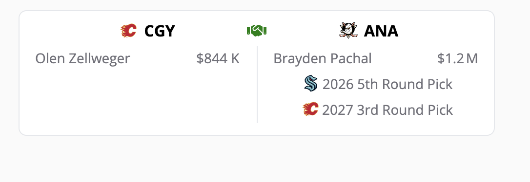 People talk about the Flames being directionless, but I feel like we need to turn our attention to the Anaheim Ducks. Trevor Zegras and Jamie Drysdale were once seen as two key players in moving this rebuild along. General Manager Pat Verbeek had a change of heart after the two struggled with injuries and inconsistent performances. I don’t want to say it’s a dumpster fire, but it doesn’t look like the Ducks are doing anything to truly help themselves. Olen Zellweger would be another youngster added as well as beefing up the left side. I like it. The worst thing that could happen is Verbeek laughs at Craig Conroy and tells him to try again.