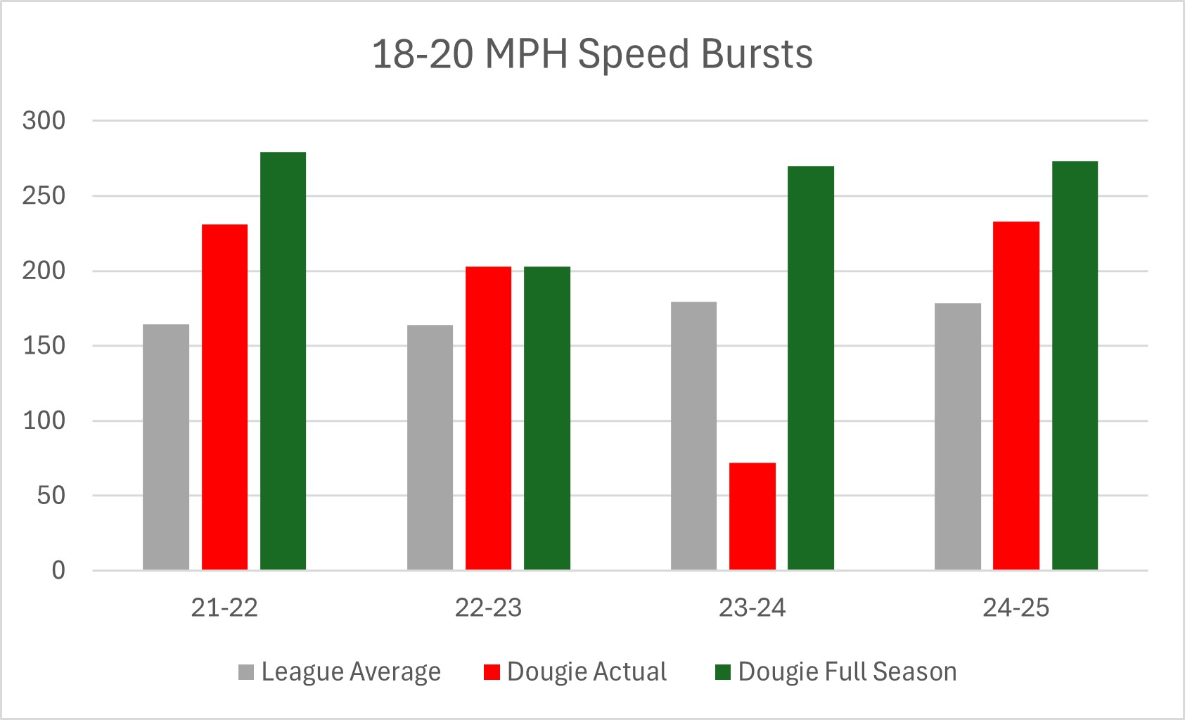 Dougie Hamilton 20-22 MPH Speed bursts, Full Season is calculated at 73 games except for 22-23 when he played 82Source: NHL Edge