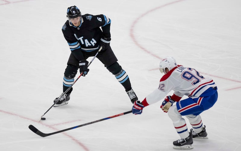 Utah Hockey Club defenseman John Marino (6) looks for a teammate to pass to during an NHL game between the Utah Hockey Club and the Montreal Canadiens at the Delta Center in Salt Lake City on Tuesday, Jan. 14, 2025. | Brice Tucker, Deseret News What will the Utah Mammoth do with all their defensemen?